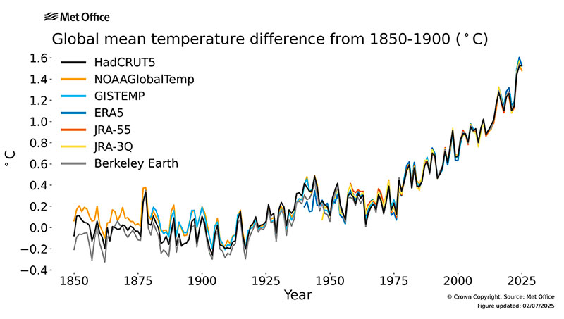 In the following graph from the Met Office (the United Kingdom’s National Meteorological Office, founded in 1854), we can observe the evolution of global temperatures and the projections for 2025.