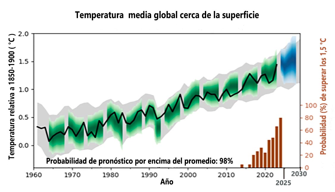 Nota: La probabilidad de que la temperatura media anual global, cercana a la superficie en 2024-2028, supere los 1,5 °C por encima de los niveles de 1850-1900, durante al menos un año, es del 80 % y aumenta con el tiempo (eje derecho marrón en la Figura).