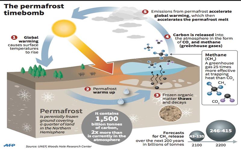 According to one estimate, permafrost soils contain about 1700 million tons of carbon, almost double the total amount of carbon currently in the atmosphere. When the soil remains frozen, the carbon is inert, but when the permafrost is thawed by increasing the temperature, the decomposition of the organic matter increases through the microbial activity. In that case amounts of CO2 and methane would go into the atmosphere. In Alaska, since the 1970s is happening, they are escaping from their CO2 emitting soils.