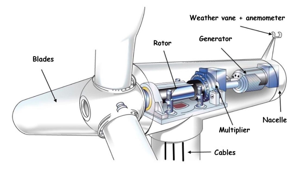 - Nacelle: It is the container of the components of the wind turbine. The blades are attached to the nose