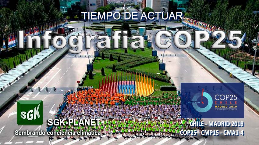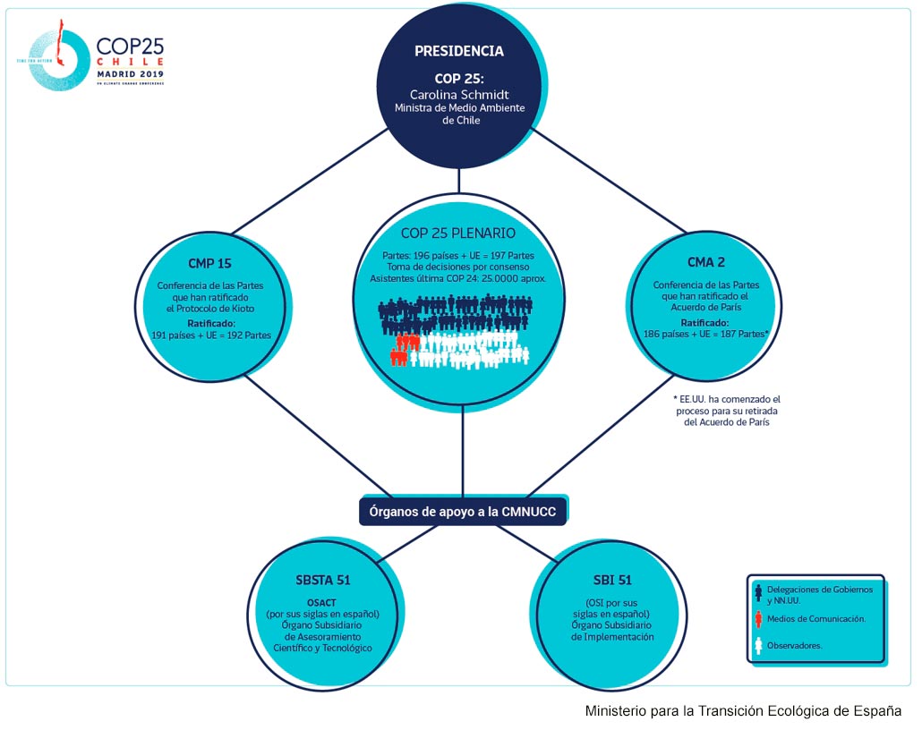 A partir del 2 de diciembre y hasta el 13 de diciembre de 2019 se realiza la COP25, Conferencia de la Partes de la Convención Marco de la Naciones Unidas sobre el Cambio Climático. En esta oportunidad Chile preside la COP bajo la presidencia de Carolina Schmidt, Ministra de Medio Ambiente de Chile y se celebra en Madrid con la organización y el apoyo logístico del Gobierno de España, representado por Teresa Ribera, Ministra de Transición Ecológica de España. La Convención Marco de de Naciones Unidas para el Cambio Climático (CMUNCC) está dirigida por su Secretaria General, Patricia Espinosa.