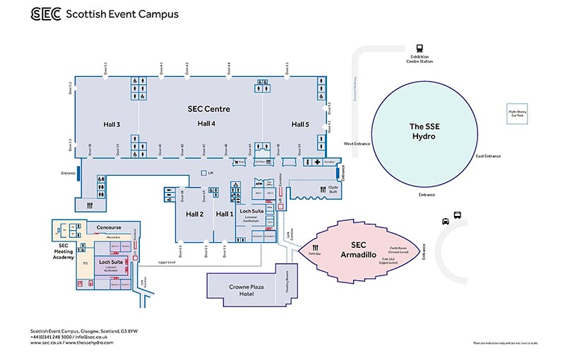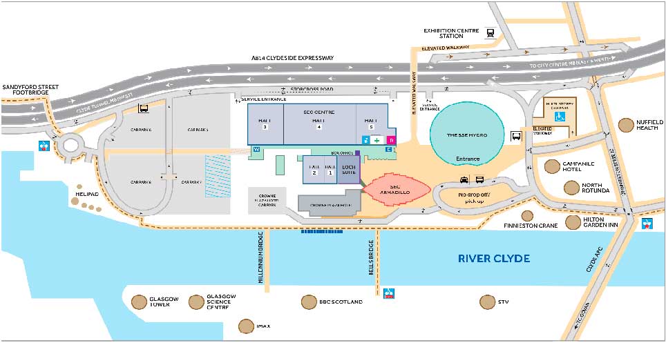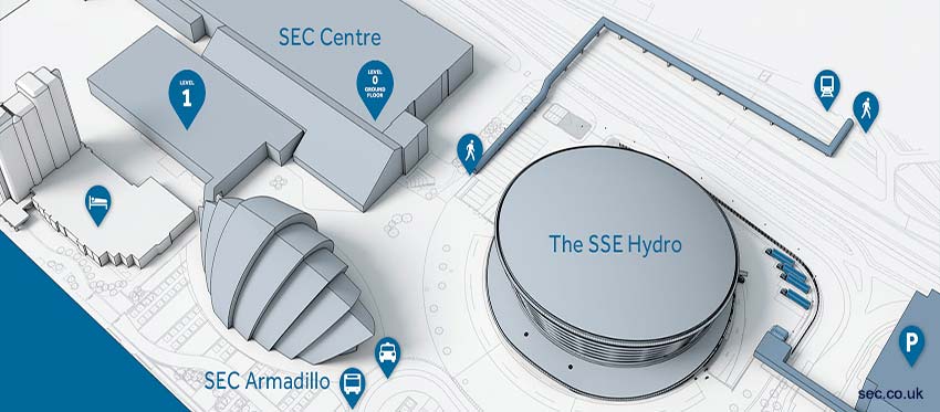 El Centro SEC, anteriormente conocido como SECC, ofrece cinco salas de reuniones y exposiciones interconectadas con un área combinada de más de 22.000 metros cuadrados