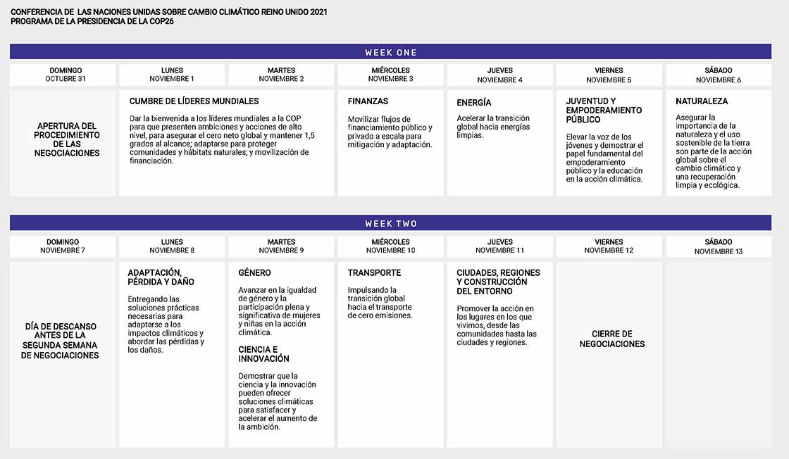 El programa de presidencia de la COP26 muestra el impulso de toda la sociedad, y se centra en cuestiones clave para impulsar la ambición y acción. El progreso de las negociaciones será el centro de la cumbre.