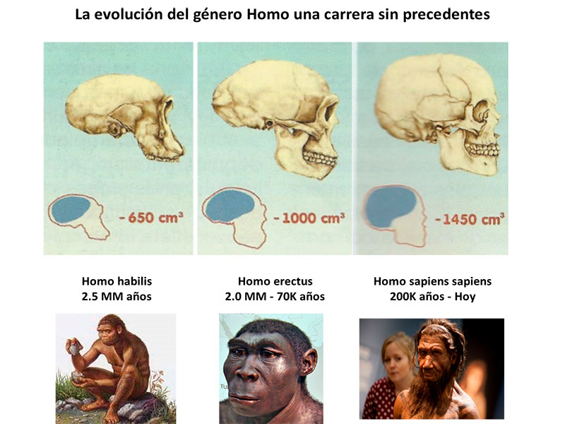 La evolución del género Homo ha sido tan vertiginosa que constituye un acontecimiento asombroso en nuestro planeta. Este veloz progreso se ha observado a través de las mediciones de los cráneos encontrados por los paleoantropólogos. con las que podían deducir el tamaños del cerebro.