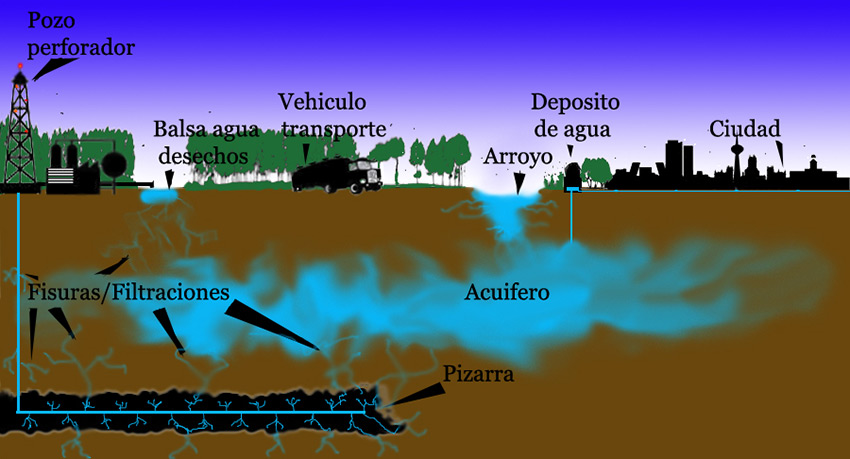 Un acuífero es un volumen de agua que se aloja bajo la superficie de la Tierra. Se encuentra en los cinco continentes. La masa total de los acuíferos es superior al agua visible de lagos y ríos. El vital líquido del subsuelo es un recurso importante, ya que provee la tercera parte del agua potable mundial. Ello explica la preocupación de los grupos ecologistas por el riesgo de su contaminación en las perforaciones profundas del fracking.