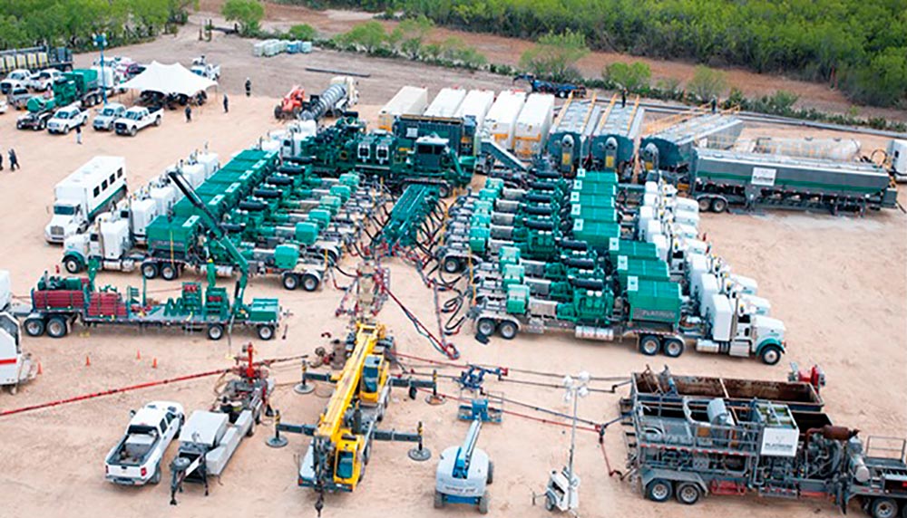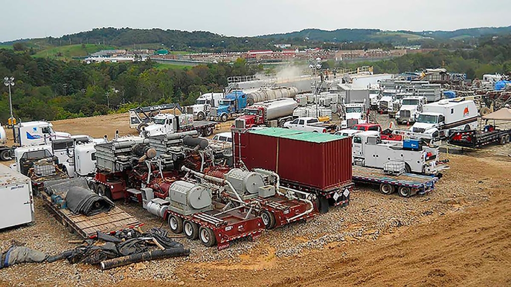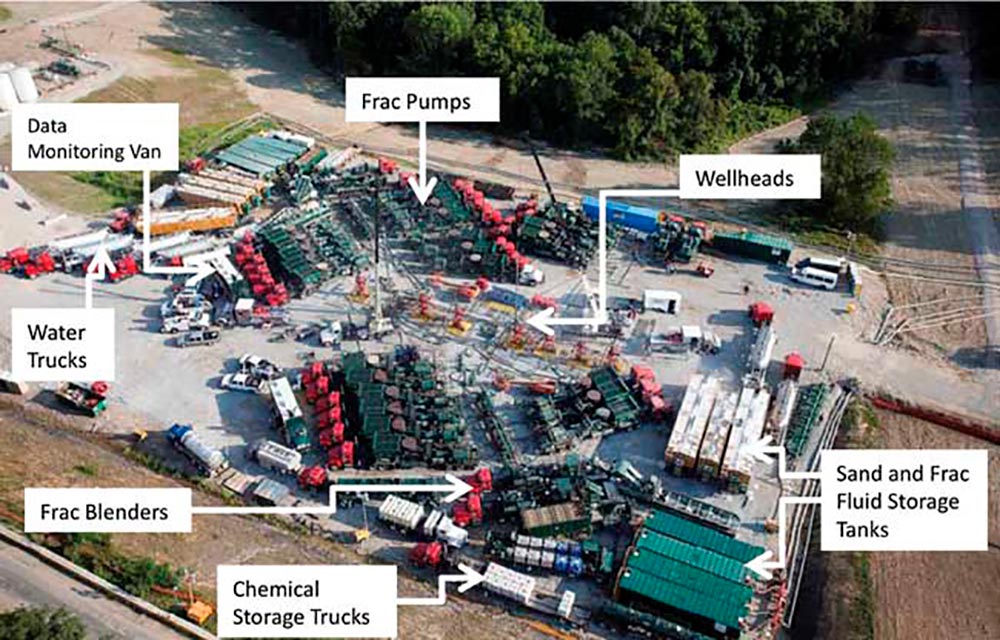 Para perforar un pozo de fracking se necesita de una compleja logística que envuelve taladros, agua, arena, productos químicos, cemento, maquinarias, transporte, etc.  Cada plataforma de pozos puede requerir varios miles de viajes para transportar maquinarias, herramientas y enseres de limpieza.