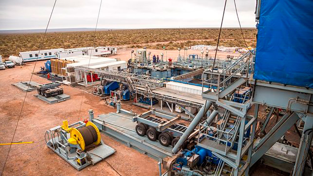 * La torre de perforación tiene 54 m. de alto. En su interior los operarios controlan el trabajo a través de monitores. Deben perforar 3.000 m. hacia abajo para alcanzar la roca de Vaca Muerta, que posee 400 m. de ancho contra 30 m. de Estados Unidos.
